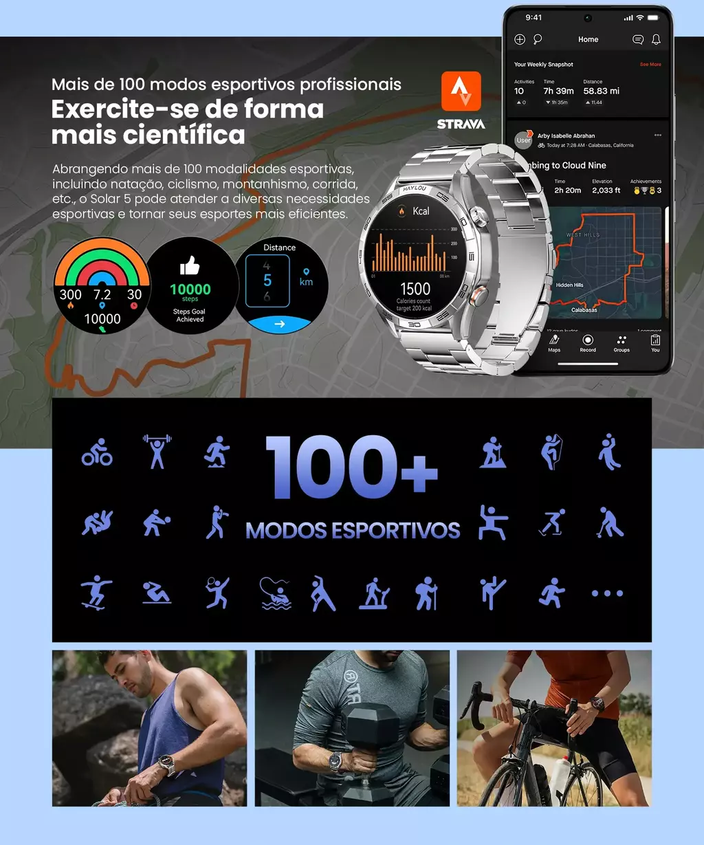 Mais de 100 Modos Esportivos: oferece uma ampla variedade de modos esportivos, desde atividades ao ar livre até exercícios indoor, permitindo acompanhar e otimizar o desempenho físico.