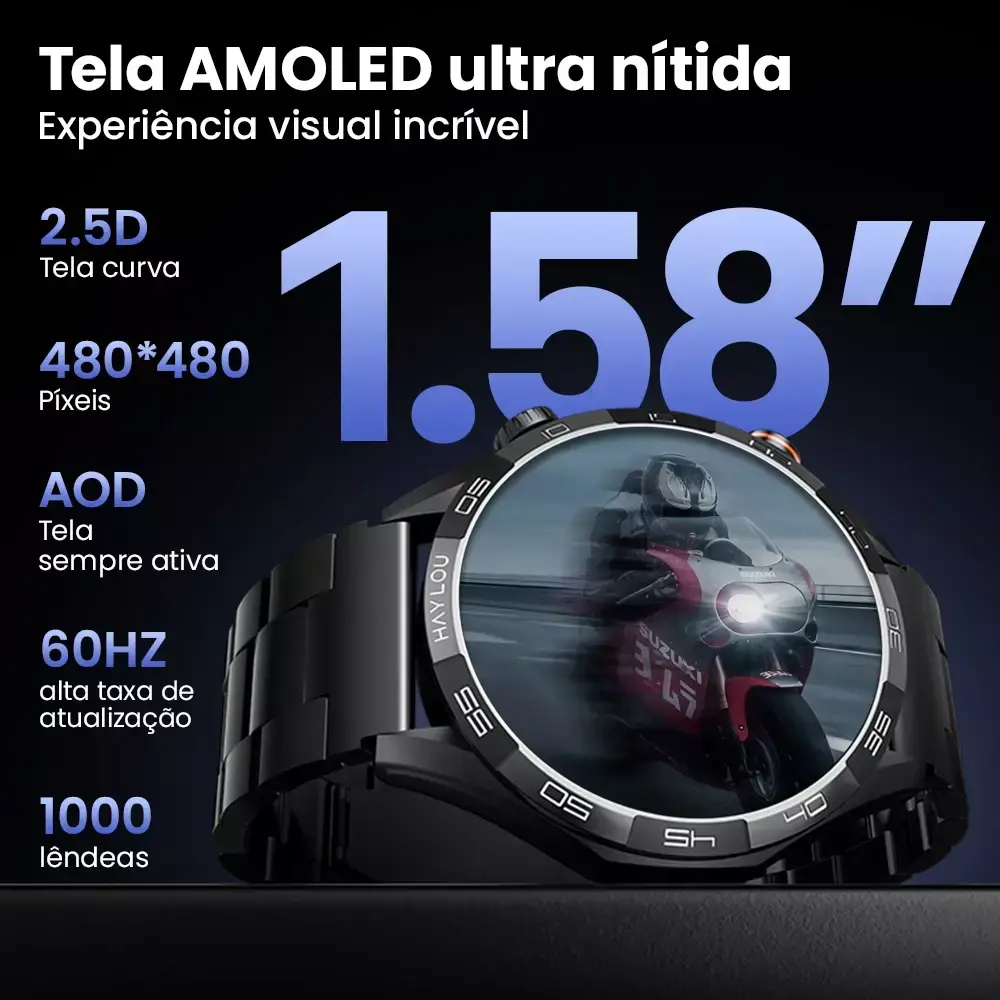Tela AMOLED de Alta Resolução: equipado com uma tela curva 2.5D de 1,58 polegadas e resolução de 480x480 pixels, o Solar 5 proporciona uma visualização clara e vibrante, com brilho de até 1000 nits, ideal para ambientes internos e externos.