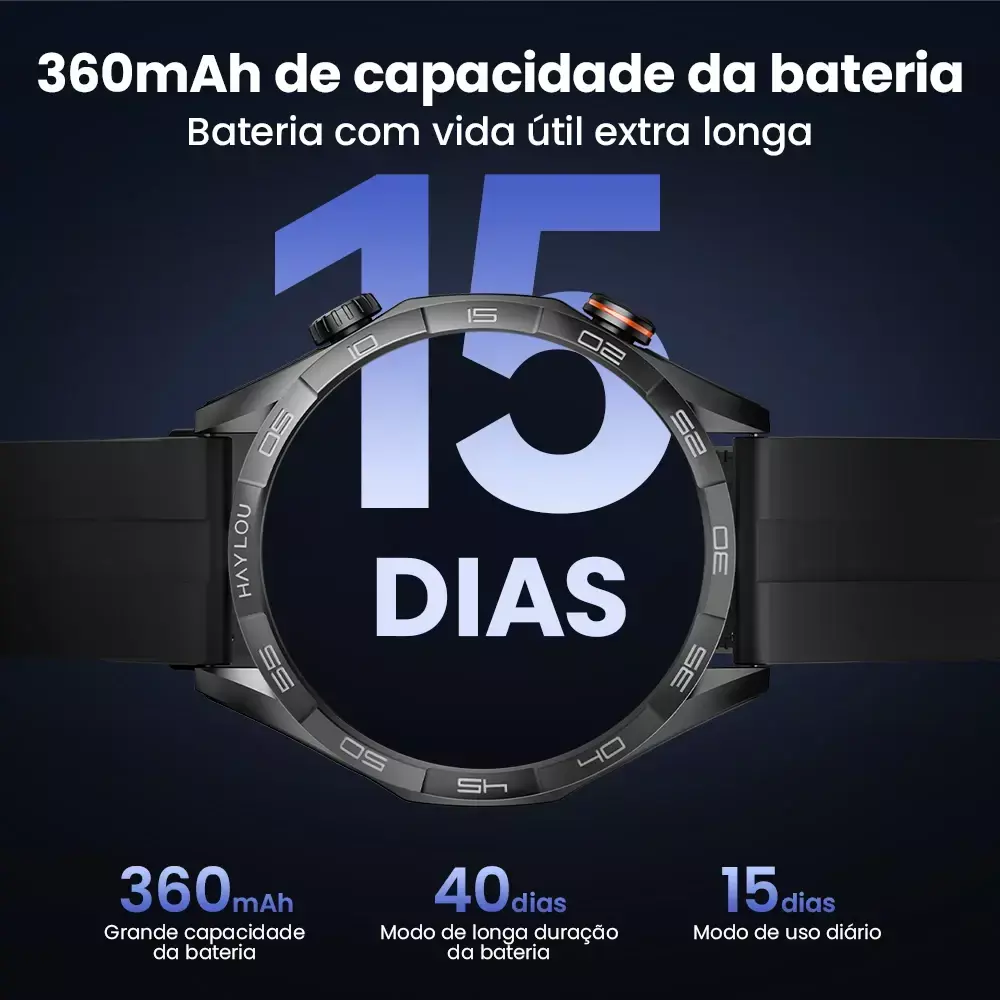 Autonomia de Bateria Prolongada: equipado com uma bateria de 360mAh, oferece até 15 dias de uso contínuo, dependendo do modo de uso, reduzindo a necessidade de recargas frequentes.